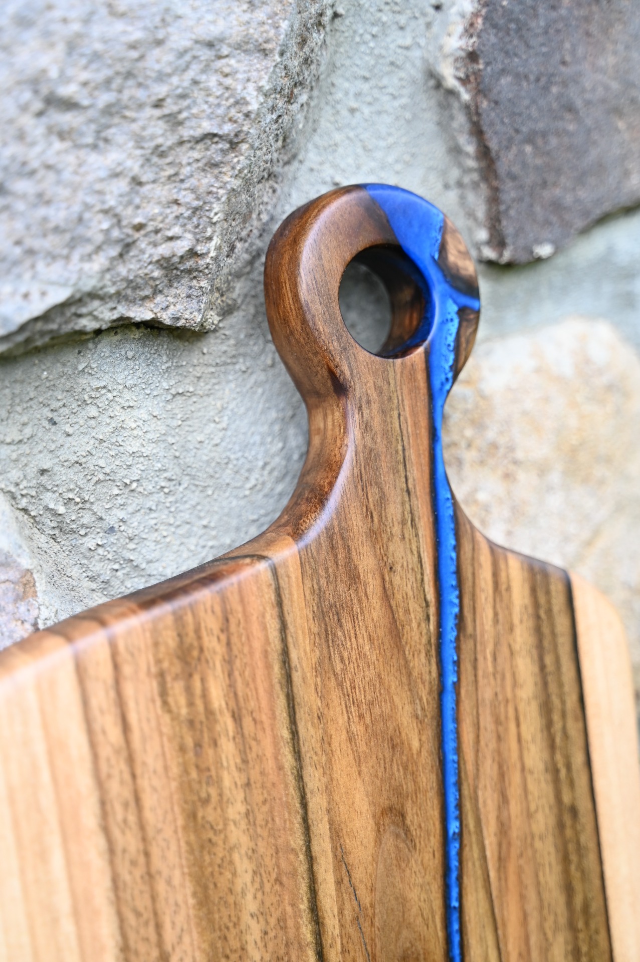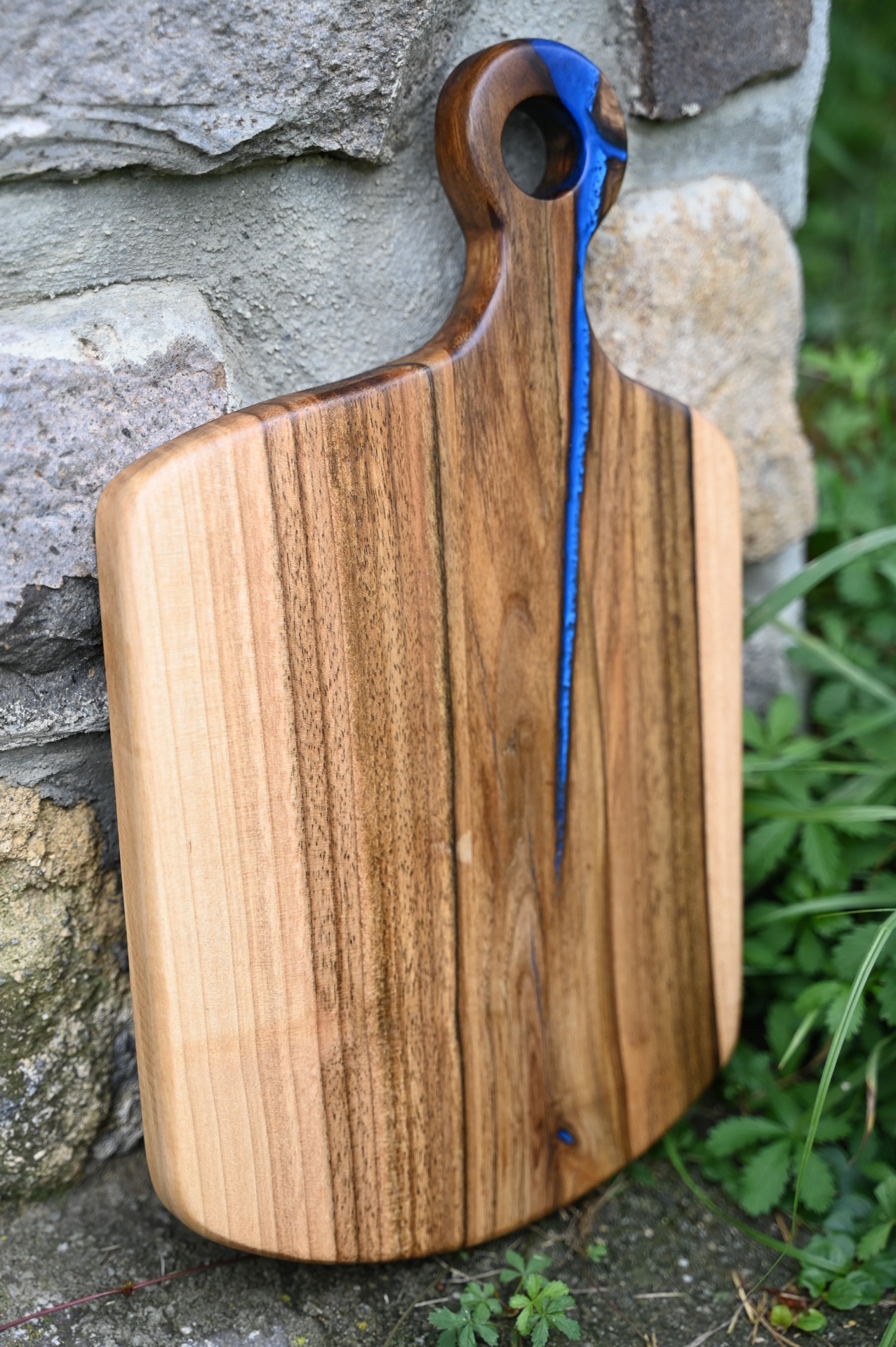 Tocător dinlemn de nuc cu inserții de rășină epoxidică.