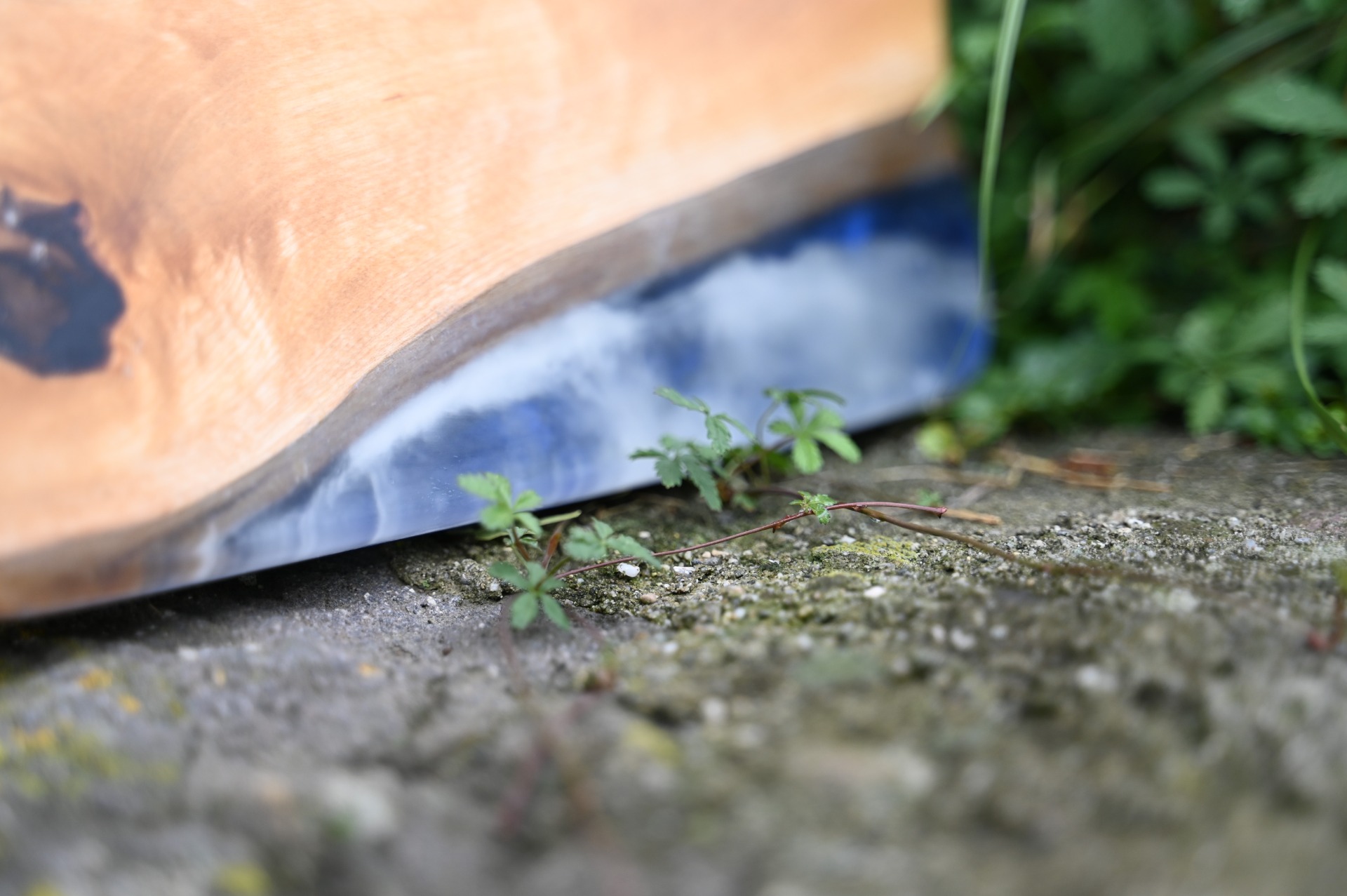 Suprafața din epoxy este tratată cu lac poliuretanic pentru un aspect perfect lucios, iar partea din lemn este finisată cu ulei mineral și ceară pentru un aspect natural. Fiecare piesă este lucrată manual cu atenție la cele mai mici detalii, de la integrarea elementelor naturale până la finisajul final, pentru a oferi un obiect de calitate, durabil și cu un design deosebit.