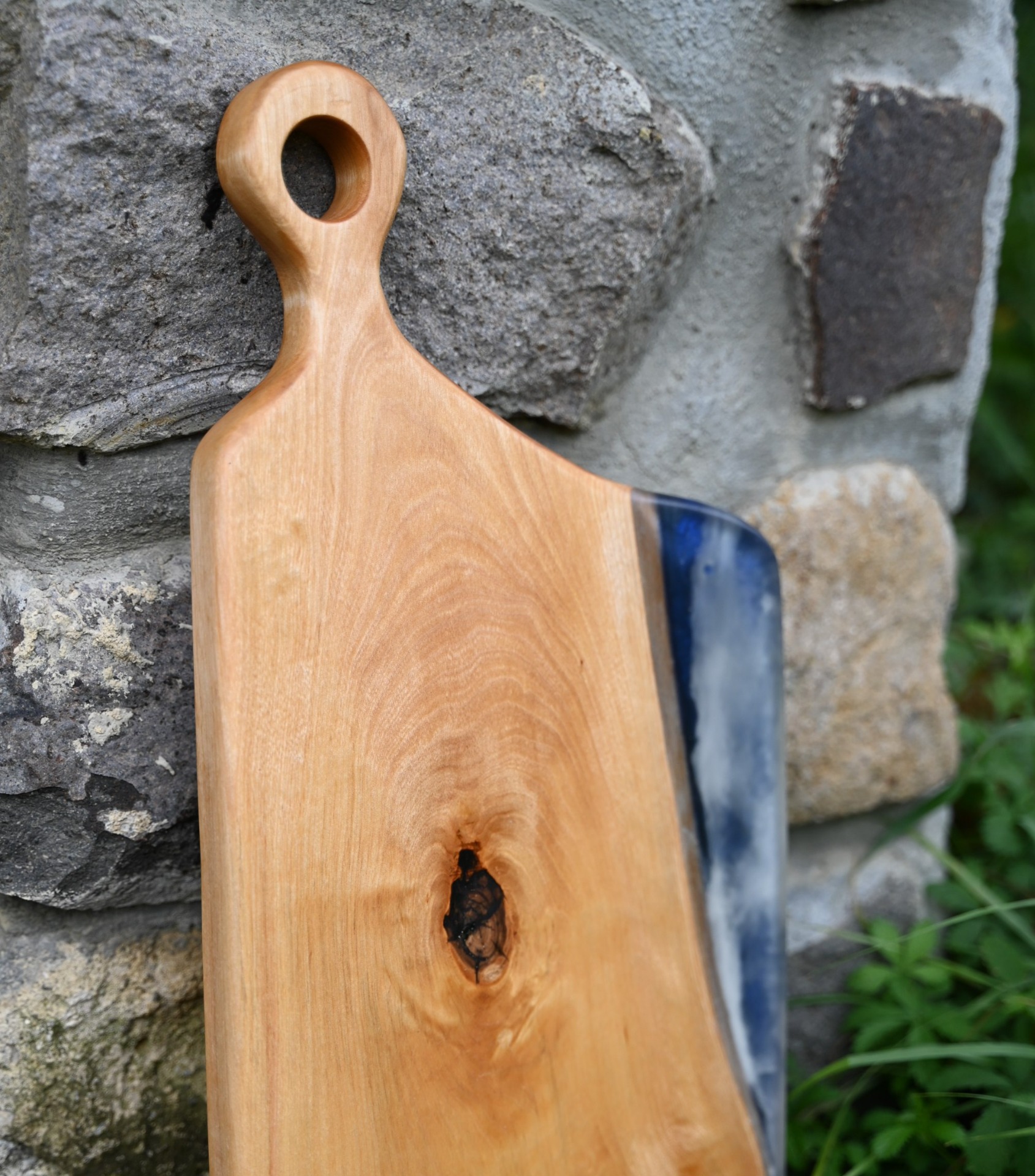 Tocător din lemn masiv de esență mesteacăn cu inserții de rășină epoxidică.