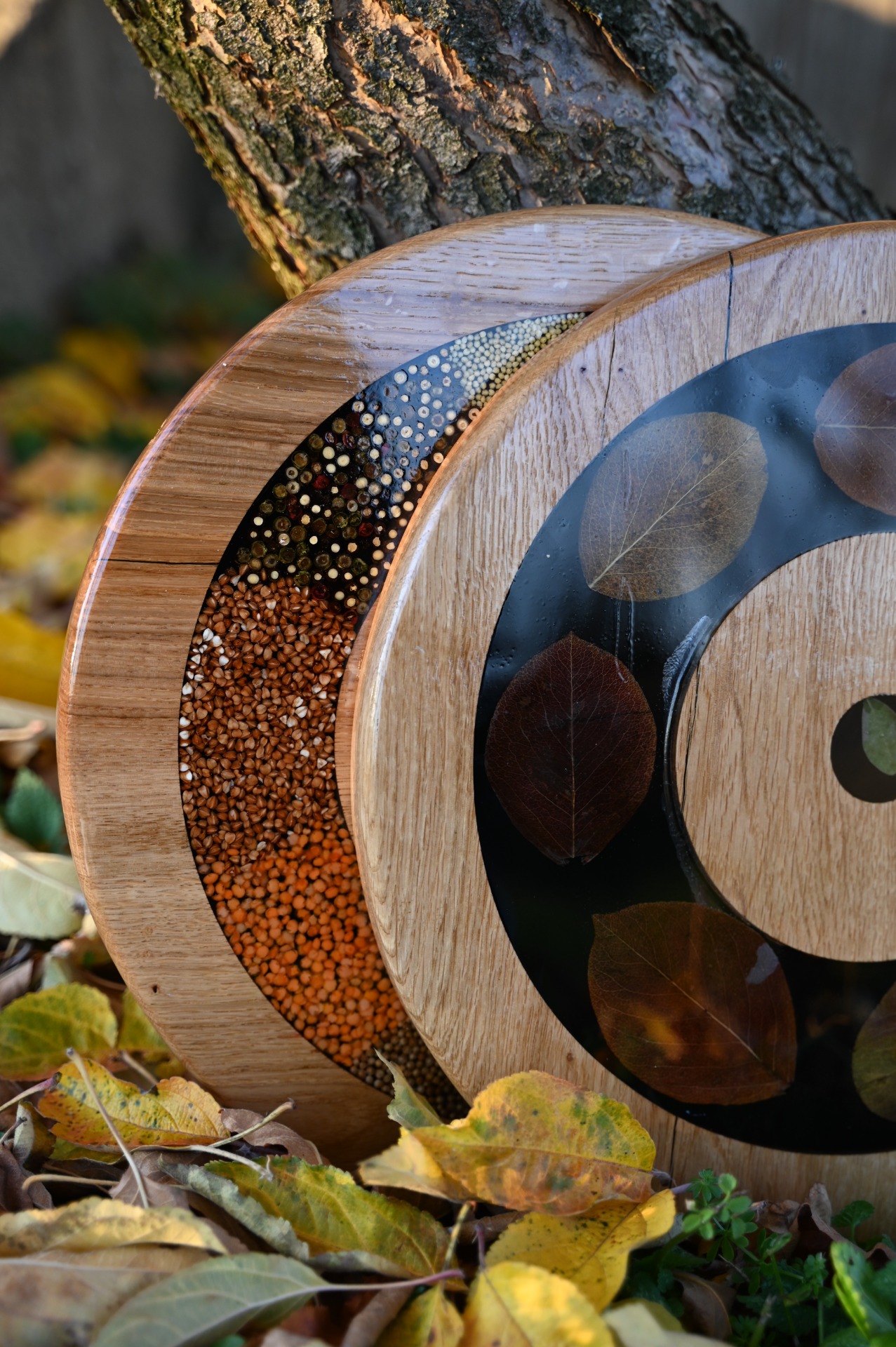 Tavă rotundă din lemn de stejar și rășină epoxidică, cu frunze de păr.