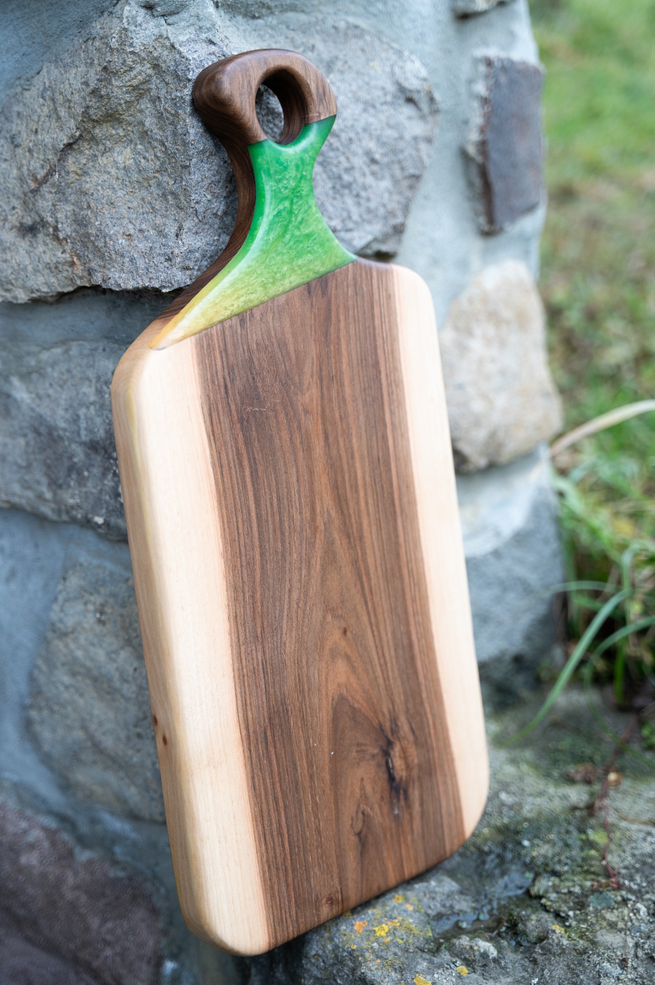 În majoritatea cazurilor, partea din epoxi este amplasată la marginea tocătorului sau în zona mânerului. Acest lucru nu este întâmplător: astfel, dacă dorești să folosești tocătorul pentru tăiere, poți lucra pe suprafața de lemn fără să deteriorezi partea din epoxy. Deși stratul de lac poliuretanic aplicat pe epoxy este într-o anumită măsură rezistent la zgârieturi, nu va rezista tăieturilor.