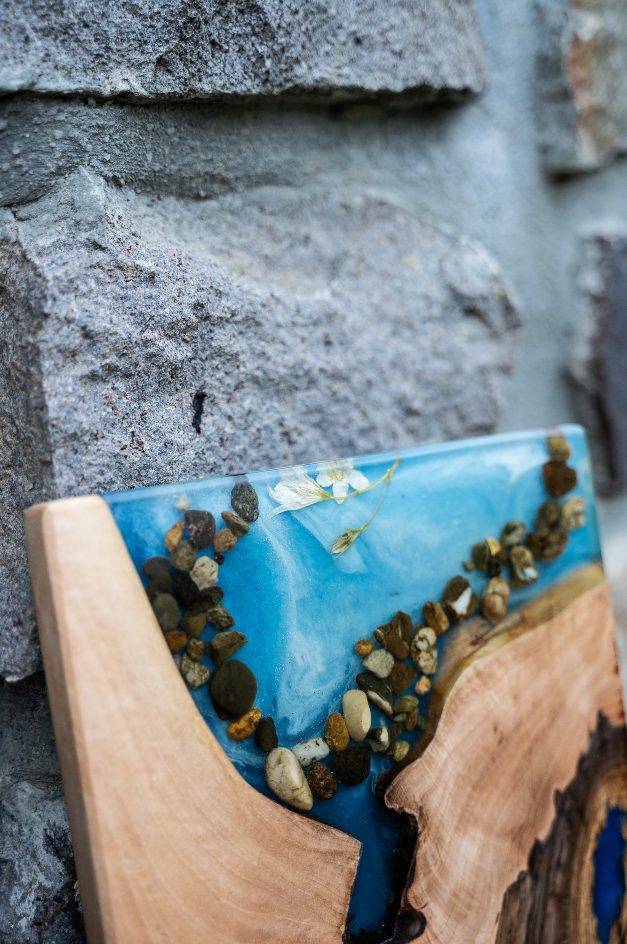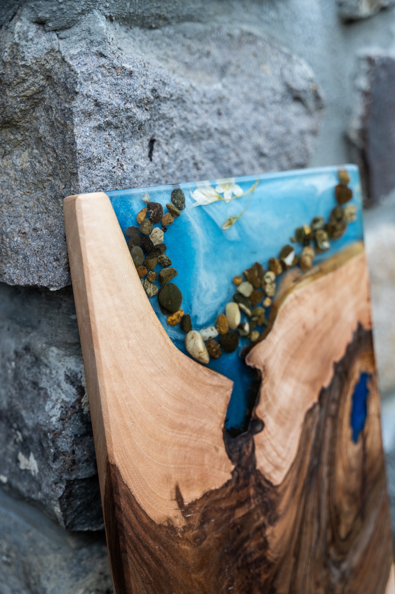 Platou din lemn de nuc și rășină epoxidică, stil marin cu pietre.